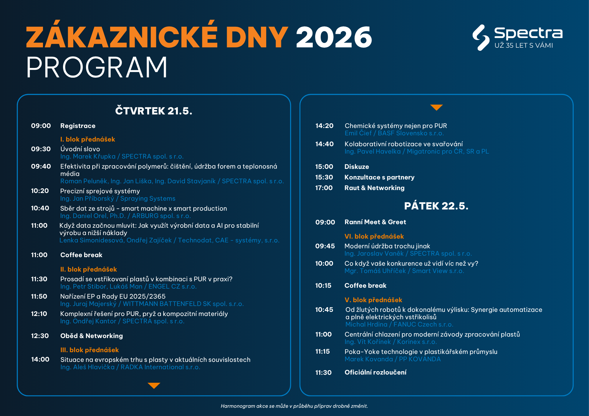 Přijměte pozvání na historicky první Zákaznické dny v našem novém areálu ve Vizovicích. Ve dnech 21.–22. května propojíme svět plastikářského, polyuretanového a strojírenského průmyslu. Čekají vás dva dny nabité odborností, praktickými ukázkami a networkingem v komunitě více než 200 profesionálů.